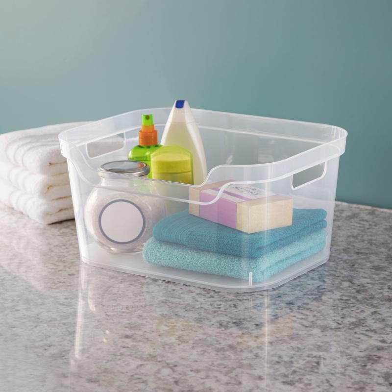 Mainstays Open Bins are a portable storage solution that makes organization easy and efficient! Whether you are cleaning up the kitchen pantry or bringing order to the bathroom closet, these bins will help get the job done. Available in 3 different sizes, Open Bins are perfect for organizing any closet or shelving space around the home. The Large Open Bin is ideal for storing anything from snacks, cereal boxes, and canned goods to office supplies, craft items, and cleaning products. The scoop front offers a convenient way to view, store and retrieve items quickly and easily, while the carry-through handles make for effortless and comfortable transport. The sturdy, banded rim adds a stylish touch to the bins, while the modern, clear design works well with any home décor. The bins feature polished sides and a textured bottom that are both easy to clean.