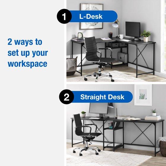 - Mainstays Two-Way Convertible Desk with Lower Storage Shelf, Black Wood Grains Finish and Black Metal Frame