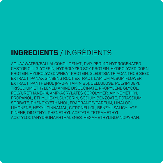 AQUA/WATER/EAU, BUTANE, POLYQUATERNIUM-4, ISOBUTANE, PROPANE, HYDROLYZED CORN PROTEIN, HYDROLYZED SOY PROTEIN, HYDROLYZED WHEAT PROTEIN, TOCOPHERYL ACETATE (VITAMIN E), AMARANTHUS CAUDATUS SEED EXTRACT, CELLULOSE, POLYURETHANE-14, CETEARETH-20, AMP-ACRYLATES COPOLYMER, POLYQUATERNIUM-11, SODIUM LAUROYL SARCOSINATE, PEG-12 DIMETHICONE, SODIUM LAURATE, TETRASODIUM GLUTAMATE DIACETATE, AMINOMETHYL PROPANOL, SODIUM CHLORIDE, SODIUM BENZOATE, ETHYLHEXYLGLYCERIN, PHENOXYETHANOL, FRAGRANCE/PARFUM, PINENE, DIMETHYL PHENETHYL ACETATE, TETRAMETHYL ACETYLOCTAHYDRONAPHTHALENES, BENZYL SALICYLATE, LINALOOL, CITRONELLOL, HEXYL CINNAMAL, HEXAMETHYLINDANOPYRAN, LIMONENE.