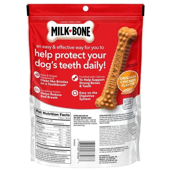 - CONTAINS: Six large Milk-Bone Brushing Chews Original Chicken Flavor dog dental treats (packaging may vary)