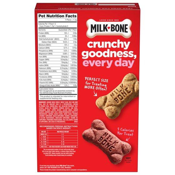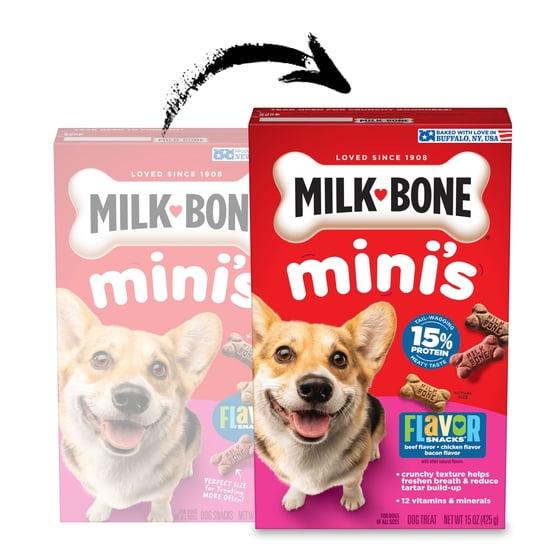 - Contains one (1) 15 ounce box of mini dog biscuits in 3 tasty flavors: beef, chicken and bacon (packaging may vary)
