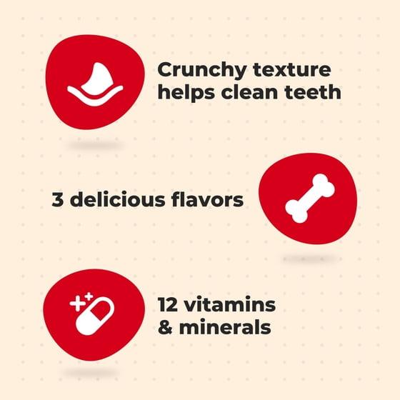- Crunchy texture helps freshen breath and reduce tartar build-up, perfect for sloppy doggie kisses
