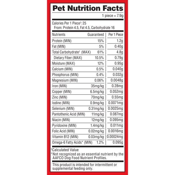 - CRUNCHY DOG TREATS WITH 15 PERCENT PROTEIN: Also fortified with vitamins and minerals like iron, zinc and vitamin B12, plus omega 6 fatty acid to help support skin and coat health