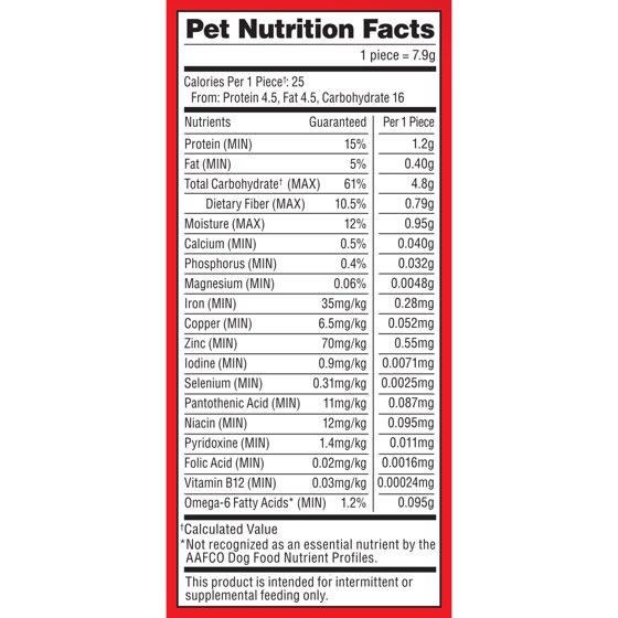 - CRUNCHY DOG TREATS WITH 15 PERCENT PROTEIN: Also fortified with vitamins and minerals like iron, zinc and vitamin B12, plus omega 6 fatty acid to help support skin and coat health