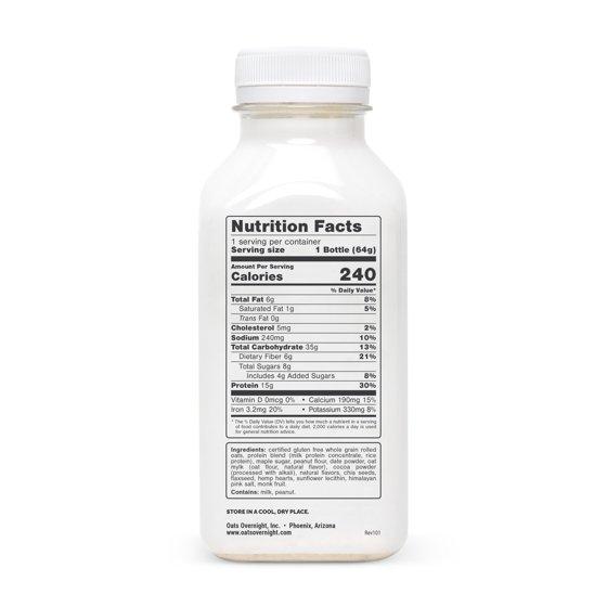 Oats Overnight protein overnight oatmeal shakes are the perfect start to your day. Simply fill with water and leave in the fridge overnight - evening prep in less than 10 seconds! With 15g of protein, high fiber, and low sugar, these shakes are a fantastic complete breakfast, meal replacement, or afternoon snack. Always sourced with clean, natural ingredients, our whole grain oats are certified non-GMO and gluten free. Peanut butter and chocolate for breakfast? Yes, please.