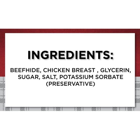 Beefhide, chicken breast, glycerin, sugar, salt, potassium sorbate (preservative).