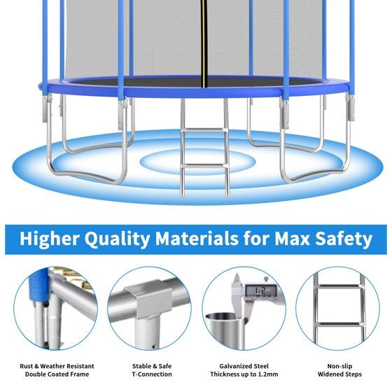 【Excellent Structure and Materials】The mainframe of the trampoline is supported by high-quality galvanized steel, 4 sets of sturdy leg tubes, and 8 sets of high-quality protection poles to provide maximum bearing capacity and protection, which can fully hold the unlimited vitality of children. The top rails are fixed with specially designed and extra reinforced T-joints to provide excellent stability, and the upgraded U-shaped leg assumes the sturdy base function.