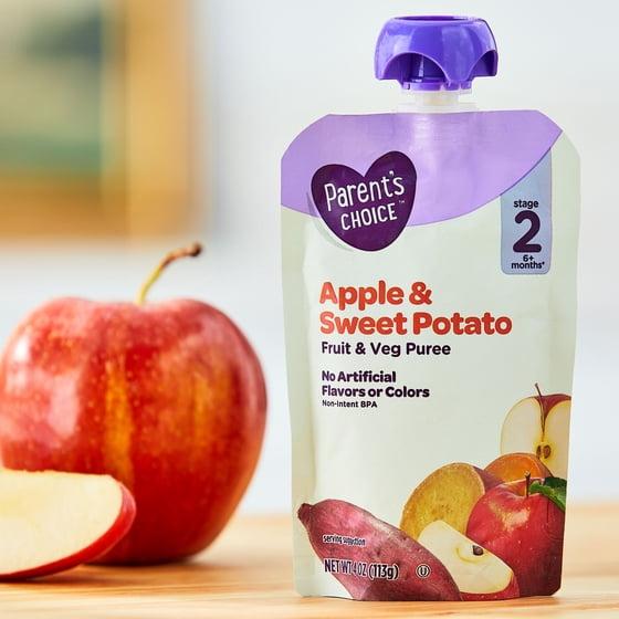Parent's Choice provides parents with baby and toddler products you need at a price that won't push your budget over the edge. We offer everything you need from bath time to bed time and every time in between, all with the high quality we know your little one needs.- Parent's Choice Stage 2 Baby Food, Apple and Sweet Potato Puree, 4 oz Pouch
