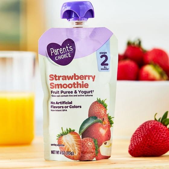 The Parent's Choice stage 2 strawberry smoothie is a delicious and nutritious snack designed for toddlers transitioning to more advanced solid foods. Packaged in a convenient 4 oz pouch, it delivers a sweet and naturally flavored strawberry smoothie thats easy for little hands to hold and enjoy on the go. Formulated specifically for stage 2 feeding, this smoothie offers a smooth texture perfect for developing taste and chewing skills. Ideal for busy parents, its great for lunchboxes, travel, or at home snacking. With the trusted quality of the Parent's Choice brand, this pouch provides a tasty, toddler friendly option that supports healthy eating habits.