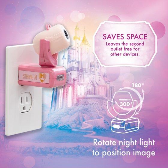 - Kids Night Light - Provides soft pink glow while projecting one of six Disney Princess images featuring Cinderella, Ariel, Aurora, Rapunzel, and Belle on ceiling, wall, or floor
