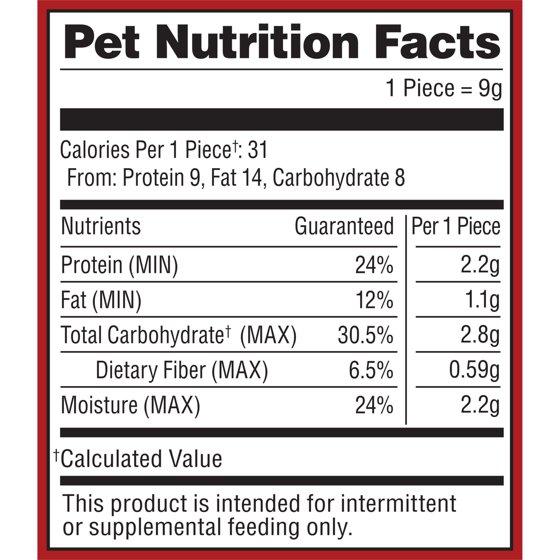 Protein Sources:Meat By-Products, Meat and Bone Meal, Beef, Chicken,Grains:Wheat Flour, Corn Grits, Corn Gluten Meal,Fats:Animal Fat (preserved with BHA/BHT),Binders/Sweeteners:Glycerin, Corn Syrup,Minerals/Additives:Calcium Carbonate, Salt, Vitamins.