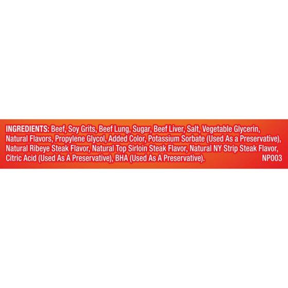 Beef, Meat By-Products, Soy Grits, Sugar, Liver, Salt, Angus Steak, Propylene Glycol, Garlic Powder, Ribeye Steak, Top Sirloin Steak, Ny Strip Steak, Potassium Sorbate (Used As A Preservative), Caramel Color, Added Color, Natural Smoke Flavor, Onion Extract, Bha (Used As A Preservative).