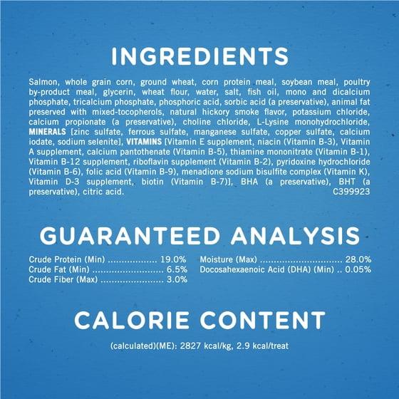 Salmon, Whole Grain Corn, Ground Wheat, Corn Protein Meal, Soybean Meal, Poultry By-Product Meal, Glycerin, Wheat Flour, Water, Salt, Fish Oil, Mono And Dicalcium Phosphate, Tricalcium Phosphate, Phosphoric Acid, Sorbic Acid (A Preservative), Animal Fat Preserved With Mixed-Tocopherols, Natural Hickory Smoke Flavor, Potassium Chloride, Calcium Propionate (A Preservative), Choline Chloride, L-Lysine Monohydrochloride, MINERALS [Zinc Sulfate, Ferrous Sulfate, Manganese Sulfate, Copper Sulfate, Calcium Iodate, Sodium Selenite], VITAMINS [Vitamin E Supplement, Niacin (Vitamin B-3), Vitamin A Supplement, Calcium Pantothenate (Vitamin B-5), Thiamine Mononitrate (Vitamin B-1), Vitamin B-12 Supplement, Riboflavin Supplement (Vitamin B-2), Pyridoxine Hydrochloride (Vitamin B-6), Folic Acid (Vitamin B-9), Menadione Sodium Bisulfite Complex (Vitamin K), Vitamin D-3 Supplement, Biotin (Vitamin B-7)], BHA (A Preservative), BHT (A Preservative), Citric Acid. C399923