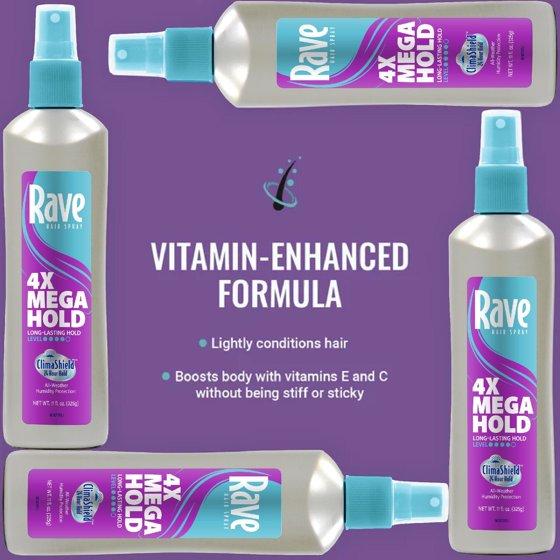 Rave® 4X Mega Unscented Hairspray With ClimaShield. The signature hold you love combined with new anti-humidity formula, Rave with ClimaShield keeps hair in place and long-lasting hold firm style control. Vitamin-enhanced formula lightly conditions hair and boosts body, without being stiff or sticky! Rave Non-Aerosol Hairspray holds your style rain or shine and provides a long lasting hold.