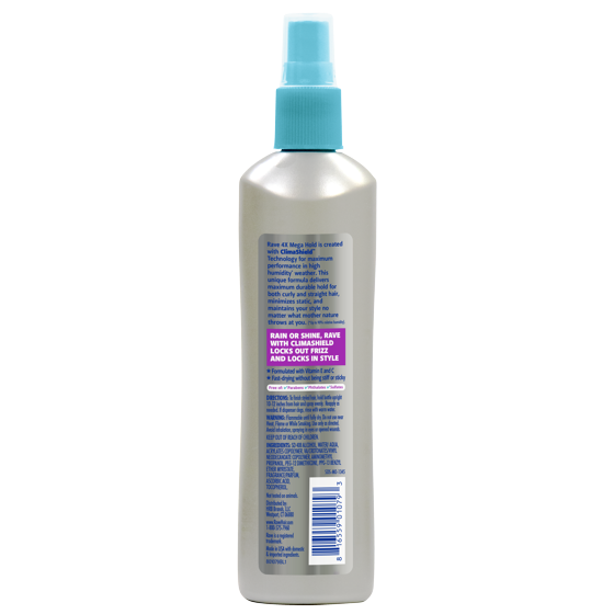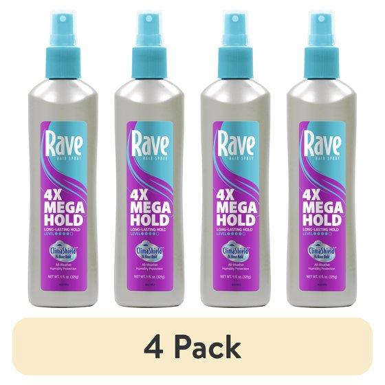Rave® 4X Mega Unscented Hairspray With ClimaShield. The signature hold you love combined with new anti-humidity formula, Rave with ClimaShield keeps hair in place and long-lasting hold firm style control. Vitamin-enhanced formula lightly conditions hair and boosts body, without being stiff or sticky! Rave Non-Aerosol Hairspray holds your style rain or shine and provides a long lasting hold.