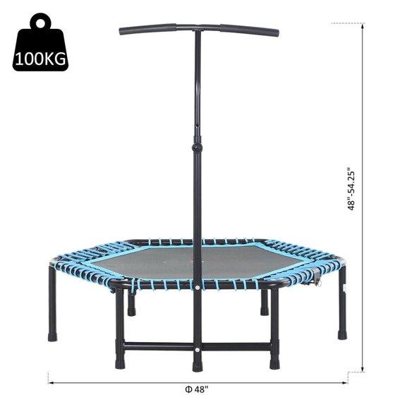1. **T-bar Height Adjustment**: Designed with a T-bar for effortless height adjustments, ensuring a comfortable workout for all. 2. **Invigorating Blue Color**: Eye-catching and invigorating blue color adds a focal point to any fitness space, motivating you to work out. 3. **Sturdy Frame & High-Quality Material**: Built with a sturdy frame and high-quality material, this trampoline ensures durability and long-lasting performance. 4. **Full-Body Workout**: Enjoy a fun and effective full-body workout with this trampoline, targeting all major muscle groups. 5. **Portable & Foldable**: The foldable design makes it easy to store and transport, perfect for home gyms or taking it to the park for a bounce session.