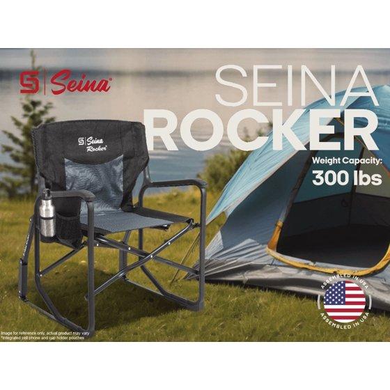 Seina Portable Outdoor Rocking Camping Chair offers sturdy support and comfort with powder-coated steel frames and durable 600D polyester fabric. Each chair comes equipped with a mesh cup holder and side pocket , providing a convenient way to keep beverages within reach. These versatile chairs also fold up for space-saving storage and easy transport. They are suitable not only for the campground but can be used at sporting events, parks, parades and much much more. Foldable with Armrests, Cup Holder and Side Pocket. Quick folding design for outdoors, patio, lawn. Supports 300 lb.