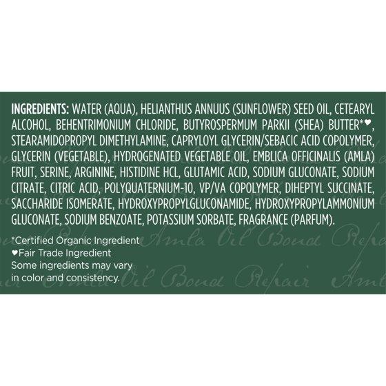 Water (Aqua), Helianthus Annuus (Sunflower) Seed Oil, Cetearyl Alcohol, Behentrimonium Chloride, Butyrospermum Parkii (Shea) Butter*(a), Stearamidopropyl Dimethylamine, Capryloyl Glycerin/Sebacic Acid Copolymer, Glycerin (Vegetable), Hydrogenated Vegetable Oil, Emblica Officinalis (Amla) Fruit, Serine, Arginine, Histidine HCl, Glutamic Acid, Sodium Gluconate, Sodium Citrate, Citric Acid, Polyquaternium-10, VP/VA Copolymer, Diheptyl Succinate, Saccharide Isomerate, Hydroxypropylgluconamide, Hydroxypropylammonium Gluconate, Sodium Benzoate, Potassium Sorbate, Fragrance (Parfum). * Certified Organic Ingredient. (a) Fair Trade Ingredient Some Ingredients May Vary in Color and Consistency.