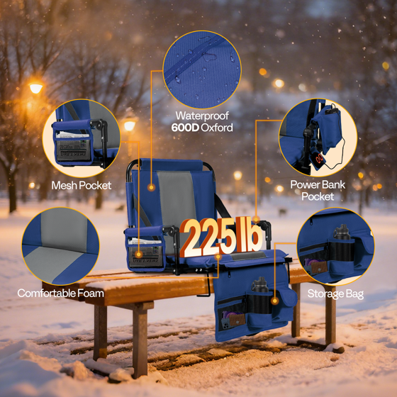 DURABLE & COMFORTABLE: Built with a robust 16mm steel tubes, this folding stadium seat offers reliable support for up to 225 lb; The rust-resistant coating and waterproof 600D Oxford fabric ensure long-lasting use in any condition; The two bottom hooks provide an extra layer of safety; The 108° reclining angle and reinforced side straps work together to ease back strain, while the foldable armrests, padded leg rest, and backrest provide all-around relaxation