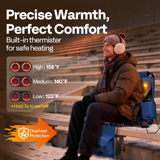 TRUE WARMTH: Enjoy personalized comfort with three temperature settings (122°F, 140°F, 158°F) and independent heating zones for the back and seat; Powered by a PD fast-charging Type-C port, the folding chair's 35W output quickly delivers cozy warmth up to 158°F, even through heavy winter clothing; The built-in thermistor prevents overheating, delivering warmth safely