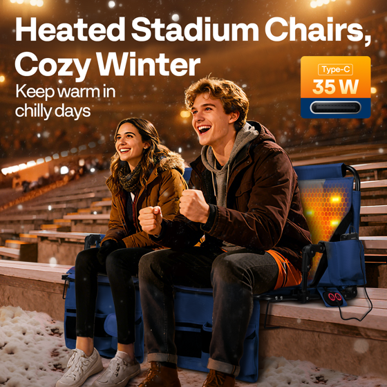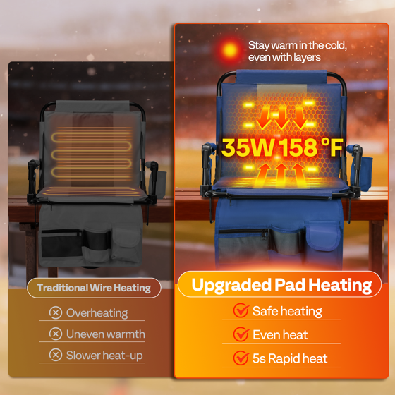 LARGE PADS, EVEN HEAT: The stadium chairs feature large heating pads (back & seat: 10.6×11.8 in) that heat up in just 5 seconds, providing even and efficient warmth; The upgraded pads enable large-area and uniform heating; Say goodbye to annoying cold spots and uncomfortable hot spots