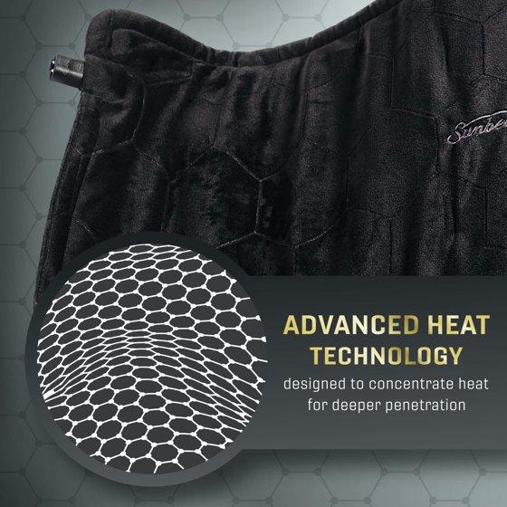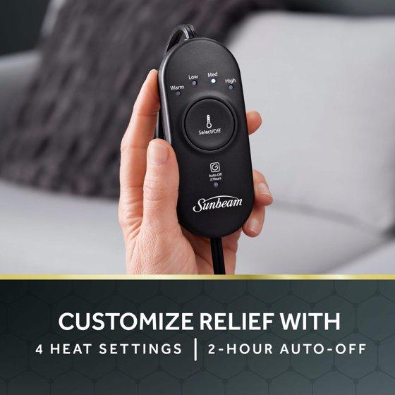 Get tough relief for tough pain with the Sunbeam AdvancedHeat Heating Pad. The 12 x 24-inch king-sized heating pad penetrates heat 2x deeper and 2x faster for more effective relief* to your back, arms, legs, and shoulders. The dual-layered graphene material inside of the heating pad uses AdvancedHeat technology, which was designed to concentrate heat with deeper penetration for tough relief from tough muscle and joint pain. Feel the heat in seconds with hotter and faster heat!* Use the easily accessible attached controller to enjoy customized treatment with 4 heat settings, and 2-hour auto-shutoff. Plus, the heating pad features an extra-long, 9-foot cord. The Sunbeam heating pad's soft, plush fabric was designed for maximum comfort and is machine washable and dryer-safe—just remove the controller! Looking for even deeper pain relief? Try moist heat therapy by spraying the pad with water for deep, penetrating pain relief. *compared to Sunbeam XpressHeat