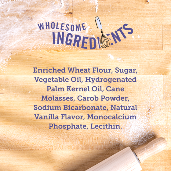 Wheat flour, vegetable oil, sugar, honey, cane molasses, hydrogenated palm kernel oil, carob powder, sodium bicarbonate, ammonium bicarbonate, natural vanilla flavor, monocalcium phosphate