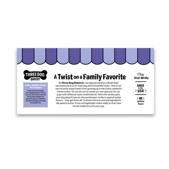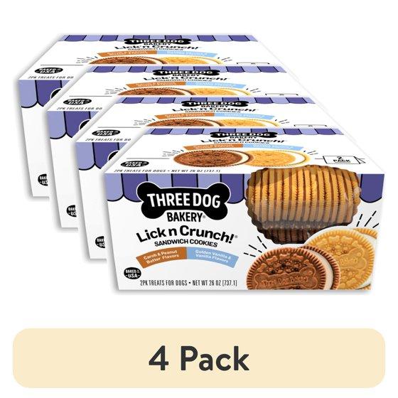 (4 pack) Three Dog Bakery Lick'n Crunch Sandwich Cookies, Carob and Peanut Butter and Golden and Vanilla Flavor, Crunchy Dog Treats, 26 oz.