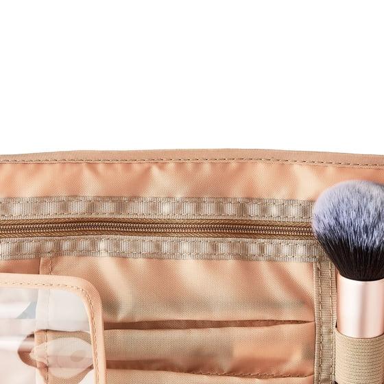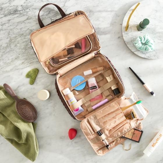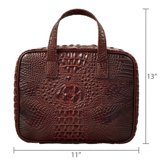 The Travel Makeup and Cosmetics Weekender is a stylish and functional organizer designed for beauty enthusiasts on the go. Measuring 11" x 8.625" x 4.75" (28 x 22 x 12 cm), this compact yet spacious bag features a convenient hanging hook, transforming any space into a pop-up dressing station. With dedicated compartments for cosmetic brushes, skincare bottles, and clear pockets for easy visibility, it ensures your essentials stay organized and accessible. Crafted from premium crocodile-embossed fabric, this weekender exudes luxury while remaining durable for everyday use. Perfect for travel or daily routines, it combines practicality with high-end style to elevate your beauty regimen.