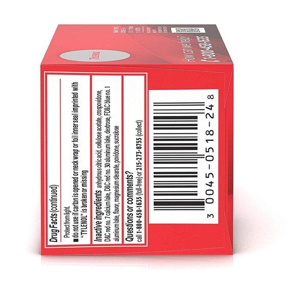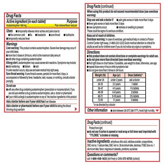 Active ingredient (in each tablet) (Purpose) Inactive Ingredients: Acetaminophen 160 mg (Pain reliever/fever reducer) Inactive ingredients anhydrous citric acid, cellulose acetate, crospovidone, D\u0026C red no. 7 calcium lake, D\u0026C red no. 30 aluminum lake, dextrose, flavor, magnesium stearate, povidone, sucraloseAnhydrous Citric Acid; Cellulose Acetate; Crospovidone; D\u0026C Red No. 7 Calcium Lake; D\u0026C Red No. 30 Aluminum Lake; Dextrose; FD\u0026C Blue No. 1 Aluminum Lake; Flavor; Magnesium Stearate; Povidone; Sucralose Active Ingredient Name: Acetaminophen