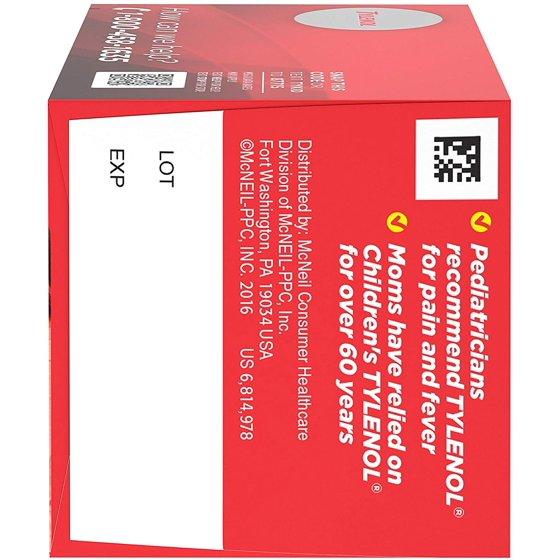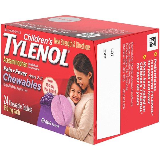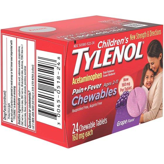 - 24-count of Children's Tylenol Chewable Tablets with acetaminophen works to temporarily relieve minor aches and pains as well as cold and flu symptoms in children, including sore throat, headache and fever