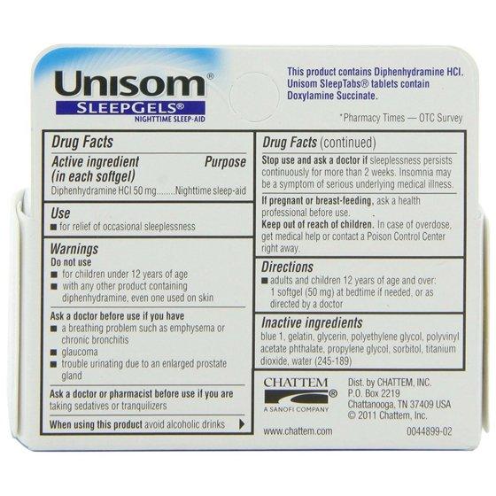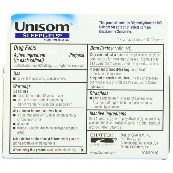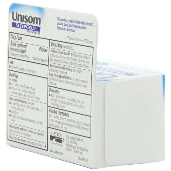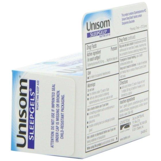 For relief of occasional sleeplessness. After a stressful day, every minute of sleep matters. After all, a restful night's sleep is important to your overall health. Unisom Sleep Gels contains # 1 pharmacist recommended sleep-aid ingredient* so you can fall asleep fast, sleep through the night, and wake refreshed. Sleep Gels are also non-habit forming. *Pharmacy Times - 2014 OTC survey.