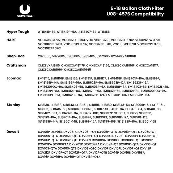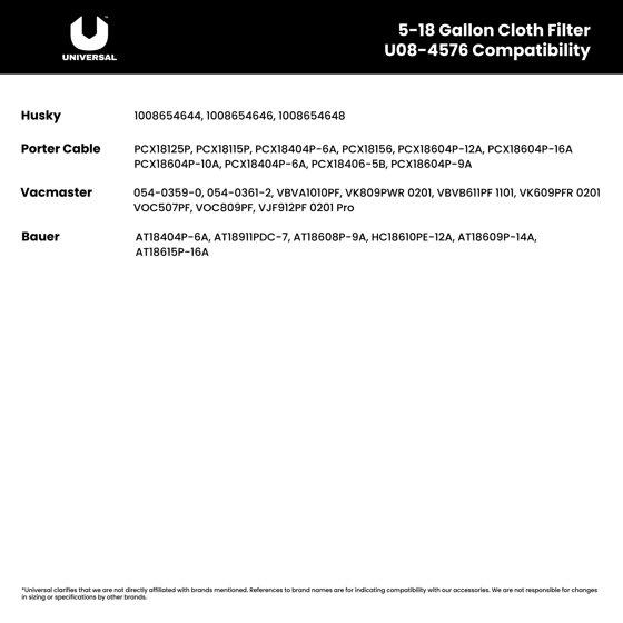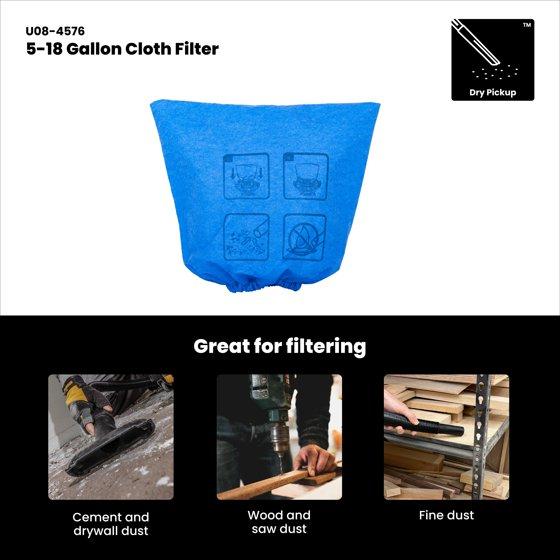 Universal Cloth Filter for Dry Pickup, 1-pack, 5-18 Gallon Wet/Dry Vacuums