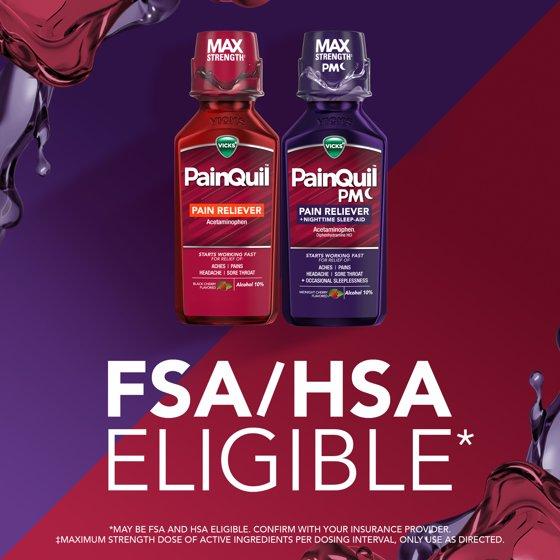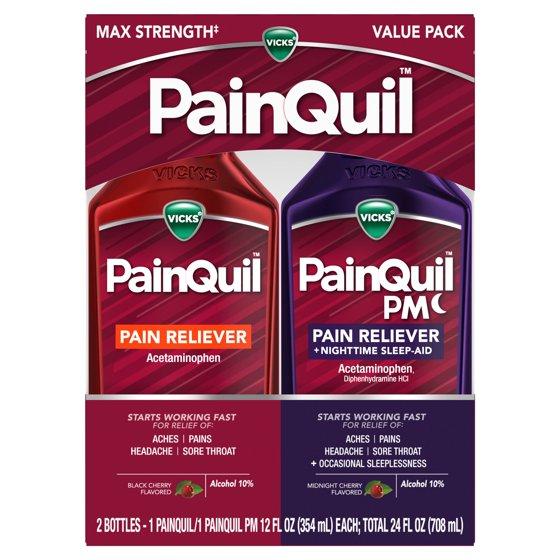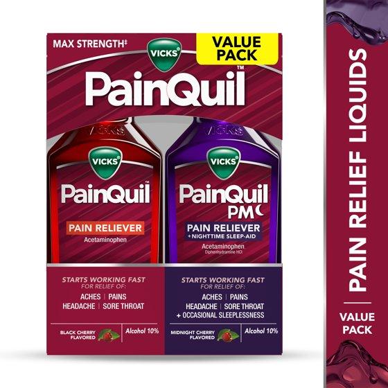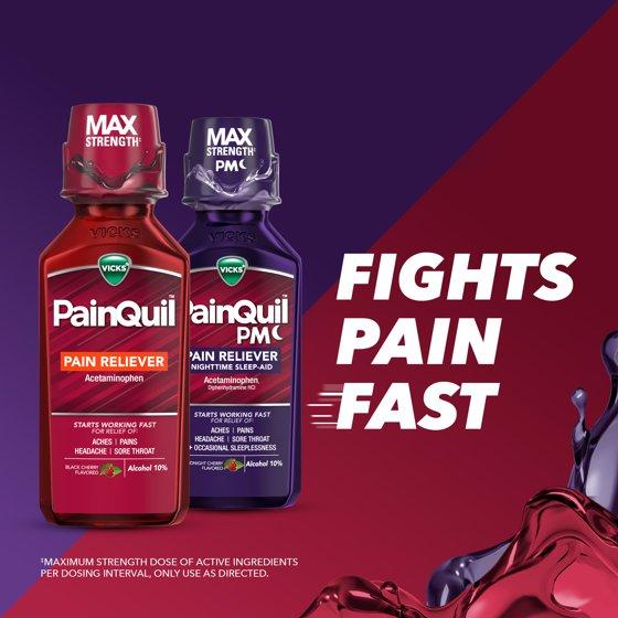 FIGHT PAIN FAST with Vicks PainQuil and PainQuil PM adult liquid pain relievers! For pain relief anytime, PainQuil Liquid Pain Reliever starts working fast for max strength headache relief, backache relief, muscular ache relief, and relief of other minor aches & pains. For pain relief at night, PainQuil PM Liquid Pain Reliever starts working fast for headache relief, backache relief, muscular ache relief, and relief of other minor aches & pains + 50mg diphenhydramine HCl per dose to help you sleep soundly. PainQuil and PainQuil PM deliver max strength+ pain relief with 1000mg Acetaminophen per dose. These adult pain reliever liquids are easy to take & deliciously flavored; PainQuil is black cherry flavored, and PainQuil PM is midnight cherry flavored. Both PainQuil and PainQuil PM are non-habit forming. They are also free of high fructose corn syrup and free of sugar. PainQuil and PainQuil PM Liquid Pain Relievers are from the makers of Vicks, with 130 years of health care expertise. +Maximum strength dose of active ingredients per dosing interval, only use as directed.