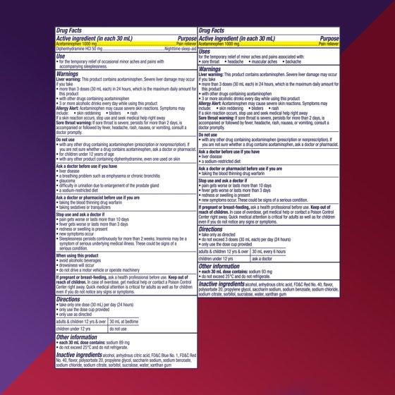In Each 30 mL: Active Ingredients: Acetaminophen (1000 mg), Pain Reliever; Diphenhydramine HCI (50 mg), Nighttime Sleep-Aid. Inactive Ingredients: Alcohol, Anhydrous Citric Acid, FD&C Blue 1, FD&C Red 40, Flavor, Polysorbate 20, Propylene Glycol, Saccharin Sodium, Sodium Benzoate, Sodium Chloride, Sodium Citrate, Sorbitol, Sucralose, Water, Xanthan Gum. In Each 30 mL: Active Ingredients: Acetaminophen (1000 mg), Pain Reliever. Inactive Ingredients: Alcohol, Anhydrous Citric Acid, FD&C Red 40, Flavor, Polysorbate 20, Propylene Glycol, Saccharin Sodium, Sodium Benzoate, Sodium Chloride, Sodium Citrate, Sorbitol, Sucralose, Water, Xanthan Gum. In Each 30 mL: Active Ingredients: Acetaminophen (1000 mg), Pain Reliever; Diphenhydramine HCI (50 mg), Nighttime Sleep-Aid. Inactive Ingredients: Alcohol, Anhydrous Citric Acid, FD&C Blue 1, FD&C Red 40, Flavor, Polysorbate 20, Propylene Glycol, Saccharin Sodium, Sodium Benzoate, Sodium Chloride, Sodium Citrate, Sorbitol, Sucralose, Water, Xanthan Gum. In Each 30 mL: Active Ingredients: Acetaminophen (1000 mg), Pain Reliever. Inactive Ingredients: Alcohol, Anhydrous Citric Acid, FD&C Red 40, Flavor, Polysorbate 20, Propylene Glycol, Saccharin Sodium, Sodium Benzoate, Sodium Chloride, Sodium Citrate, Sorbitol, Sucralose, Water, Xanthan Gum.