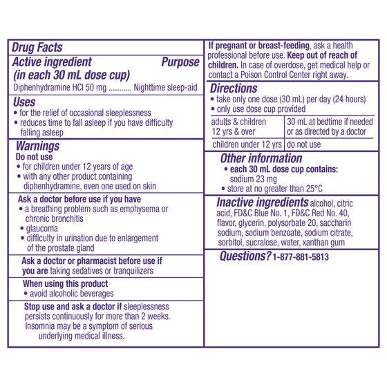 Active Ingredients: Diphenhydramine HCl (50 mg). Purpose: Nighttime sleep-aid, in Each 30 ml Dose Cup or 2 Tablespoons. Inactive Ingredients: Citric Acid, Ethanol, FD&C Blue 1, FD&C Red 40, Flavor, High Fructose Corn Syrup, Polyoxyl 40 Stearate, Propylene Glycol, Purified Water, Saccharin Sodium, Sodium Benzoate, Sodium Citrate Dihydrate.