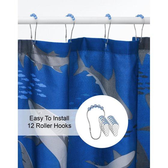 Elevate your child's bath time with the Your Zone Navy Shark Polyester Shower Curtain and Hooks Set. This charming ensemble includes a vibrant shower curtain with a wonderful shark design, along with matching hooks to complete the look. Whether you choose to coordinate it with other pieces from the Your Zone Bath Collection or use it as a standalone feature, this set offers versatility and style. The shower curtain features 12 convenient buttonholes along the top for effortless hanging. With its lively shark design, it's sure to make your child's bath time a fun and exciting adventure, all while keeping the bathroom looking cheerful and inviting.