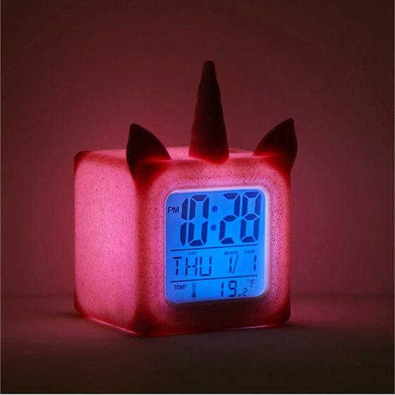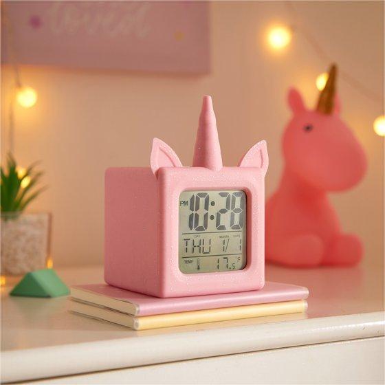 Introducing Your Zone's Enchanting Light-Up Pink Unicorn with Glitter Cube Alarm Clock - A Magical Addition to Your Space! Let the magic unfold with the Light-Up Pink Unicorn with Glitter Cube Clock from Your Zone. This delightful clock combines functionality with whimsy, bringing a touch of enchantment to any room. Featuring a battery-operated design (3AAA batteries, not included), this clock is not only portable but also ensures you'll never miss a beat. The clear and easy-to-read display shows the time, date, and week in both 12-hour and 24-hour formats, keeping you on schedule effortlessly. Immerse yourself in a kaleidoscope of colors with the LED color-changing feature. With 7 mesmerizing colors, you can set the perfect ambiance to suit your mood or the room's decor. Keep track of the temperature in Celsius or Fahrenheit with the built-in temperature display, ensuring you stay cozy no matter the weather outside. Personalize your wake-up experience with 8 different alarm styles to choose from. Whether you prefer a gentle melody or a cheerful beep, waking up will be a delightful experience. Enjoy a few extra moments of rest with the handy snooze button, allowing you to catch some Zs without oversleeping. Bring the wonder and charm of unicorns into your space with this captivating Light-Up Pink Unicorn with Glitter Cube Clock. Embrace the magic and make every moment count! Order yours now and let the enchantment begin!
