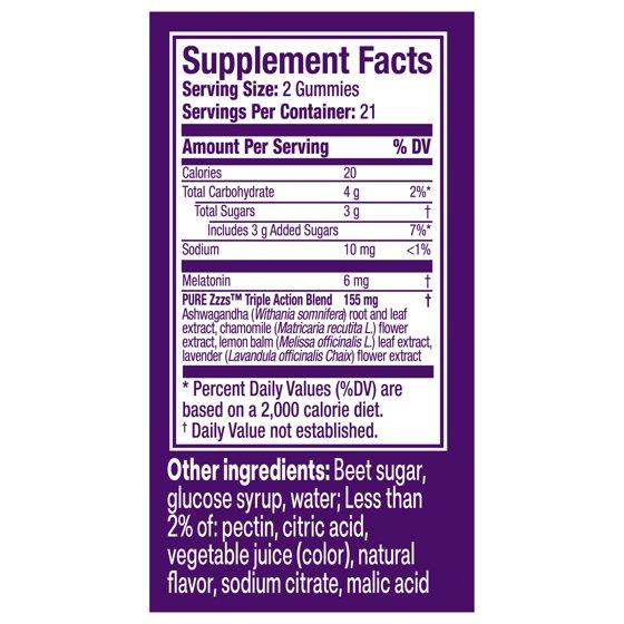 Melatonin 6 mg, PURE ZzzsTriple Action Blend 230mg : Ashwagandha (Withania somnifera) Root And Leaf Extract, Chamomile (Matricaria recutita L.) Flower Extract, Lemon Balm (Melissa officinalis L.) Leaf Extract, Valerian (Valeriana officinalis L.) Root Extract, Lavender (Lavendula officinalis Chaix) Flower ExtractOther Ingredients: Corn Syrup, Water, Sugar, Less Than 2% Of: Maltodextrin, Hydrogenated Coconut Oil, Pectin, Natural Flavors, Sodium Potassium Tartrate, Citric Acid, Soy Lecithin, Sodium Citrate, Malic Acid, Sodium Polyphosphate, Red 40, Blue 1 Daily Value (DV) not established
