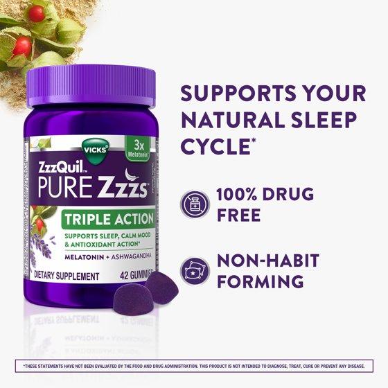 ZzzQuil PURE ZzzsTriple Action Melatonin Gummies are designed to help calm your mind and body before bed.* This dietary supplement sleep aid is formulated with 3x the melatonin (melatonin 6mg per serving, melatonin 3mg per gummy) compared to ZzzQuil PURE Zzzs to boost antioxidant action.* This melatonin and ashwagandha sleep aid works naturally with your body to support your body's natural sleep cycle and soothe the consequences of occasional stress like sleeplessness, irritability, inability to concentrate*. They contain Ashwagandha, an adaptogenic herb to help you deal with occasional stress.* Ashwagadnha has been used for centuries in traditional Ayurvedic medicine. If you've been having occasional sleeplessness , whether it's caused by stress, changes in your schedule, or just restless thoughts, you may be considering adding a melatonin sleep aid to your nighttime routine as a solution. ZzzQuil PURE Zzzs Triple Action Melatonin gummies are a great choice when you are dealing with occasional sleeplessness because they are drug-free and non-habit forming. This ZzzQuil PURE Zzzs melatonin sleep aid works naturally with your body to support sleep and is specially formulated with 6mg melatonin and ashwagandha. They also include a complementary blend of botanicals including chamomile, lavender, lemon balm, and valerian root. ZzzQuil PURE Zzzs was developed by the trusted experts at Vicks, because everyone deserves a great night's sleep. ZzzQuil is the World's #1 Sleep Aid Brand! *These statements have not been evaluated by the Food and Drug Administration. This product is not intended to diagnose, treat, cure, or prevent any disease. Source Euromonitor International Limited; Consumer Health 2024 Edition; Sleep Aids, all channels, retail selling price, Global Brand Name ZzzQuil 2023 data