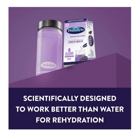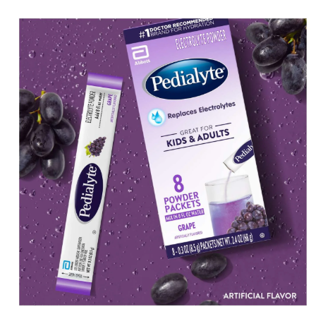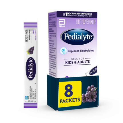 Pedialyte is the #1 doctor-recommended brand for hydration in the US and has been rehydrating families since 1966. Pedialyte electrolytes powder packets have 2x the electrolytes and 50% less sugar vs the leading sports drink.* When you’re dealing with dehydration† due to vomiting, diarrhea, extreme heat, exercise, and travel, try Pedialyte. Just mix 1 electrolytes powder packet with 8 fl oz of water, then stir or shake until dissolved. It’s great for kids and adults. These hydration packets provide a convenient on-the-go option to help replace electrolytes so you can feel better fast. * Pedialyte Classic powders have 1100mg sodium and 25g sugars per liter; leading sports drink has ~460mg sodium and ~58g sugars per liter. † Mild to moderate dehydration.
