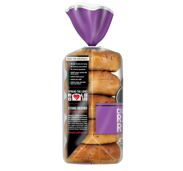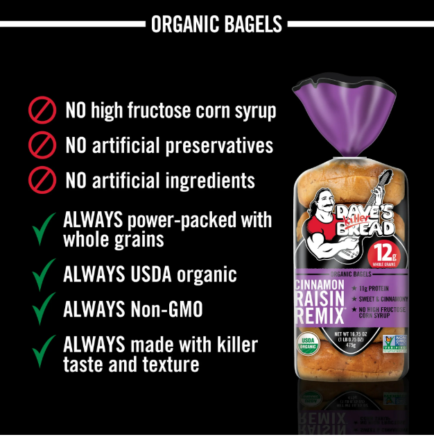 Dave's Killer Bread® Cinnamon Raisin Remix® Organic Bagels are shelf-stable USDA organic cinnamon raisin bagels with killer taste and hearty texture to mix up your morning routine. With 12g protein and 11g whole grains per bagel, these sweet and cinnamony organic whole grain bagels have no high-fructose corn syrup and no artificial ingredients. You can trust Dave's Killer Bread® to deliver killer taste, texture and whole grain nutrition. Cinnamon Raisin Remix® 5 Ct bagels are pre-sliced and ready to be slathered in smooth cream cheese or butter. Or you can stack up the goods for a bagel breakfast sandwich. Just open up a breakfast bagel and you're on your way to a cinnamon raisin bread sandwich. Remix for your morning with Dave's Killer Bread® Cinnamon Raisin Remix® bagels. The story of Dave's Killer Bread® began at the Portland Farmers Market, when Dave Dahl and his nephew brought some loaves of Dave's bread to sell. For Dave, this marked the beginning of a new chapter in his life. Though he grew up in a family of bakers, his life took a different path. A path that landed him in prison for 15 years. Determined to prove his worth and make a positive impact, Dave worked tirelessly to bake breads that tasted unlike anything else on the market—packed with seeds and grains, made with only the very best organic and Non-GMO Project Verified ingredients. Dave's Killer Bread® believes everyone is capable of greatness. One in three of the company's employee partners at their Milwaukie, OR, bakery has a criminal background—but your past doesn't define your future. As a proud Second Chance Employer, Dave’s Killer Bread® truly believes everyone deserves a second chance to become a Good Seed.