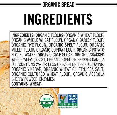 Organic Flours (Organic Wheat Flour, Organic Whole Wheat Flour, Organic Barley Flour, Organic Rye Flour, Organic Spelt Flour, Organic Millet Flour, Organic Quinoa Flour, Organic Potato Flour), Water, Organic Cane Sugar, Organic Cracked Whole Wheat, Organic Expeller Pressed Canola Oil, Contains 2% or Less of Each of the Following: Sea Salt, Yeast, Organic Wheat Gluten, Organic Cultured Wheat Flour, Organic Vinegar, Organic Acerola Cherry Powder, Enzymes. 520-111219
