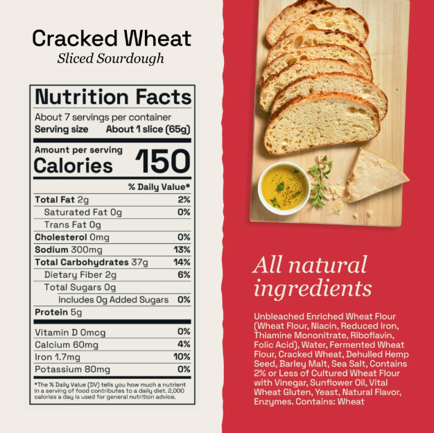 Unbleached Enriched Wheat Flour (Wheat Flour, Niacin, Reduced Iron, Thiamine Mononitrate, Riboflavin, Folic Acid), Water, Fermented Wheat Flour, Cracked Wheat, Dehulled Hemp Seed, Barley Malt, Sea Salt, Contains 2% or Less of Cultured Wheat Flour with Vinegar, Sunflower Oil, Vital Wheat Gluten, Yeast, Natural Flavor, Enzymes.