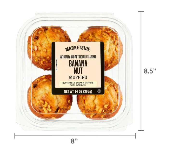 Marketside Banana Nut Muffins are a great any-time sweet treat that quickly satisfies your sweet-tooth craving. These exquisite muffins are moist, soft, and loaded with real banana and topped with crunchy walnuts for a pop of flavor in every bite. Try these muffins for breakfast with a hot cup of coffee or tea, as a sweet snack with a tall, cold glass of milk, or as a scrumptious dessert after dinner. Conveniently packaged with four regular-sized muffins per pack in a resealable container that maintains freshness, these muffins are perfect to share with friends and family or save and savor by yourself.