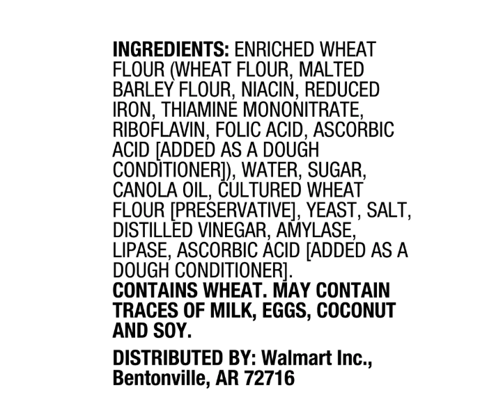 ENRICHED WHEAT FLOUR (WHEAT FLOUR, MALTED BARLEY FLOUR, NIACIN, REDUCED IRON, THIAMINE MONONITRATE, RIBOFLAVIN, FOLIC ACID, ASCORBIC ACID [ADDED AS A DOUGH CONDITIONER]), WATER, SUGAR, CANOLA OIL, CULTURED WHEAT FLOUR [PRESERVATIVE], YEAST, SALT, DISTILLED VINEGAR, AMYLASE, LIPASE, ASCORBIC ACID [ADDED AS A DOUGH CONDITIONER].