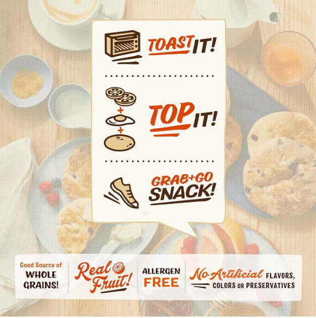 Make it last! Freeze and re-heat to maintain freshness. Warm for 1 minute at 400 degrees F to enjoy fresh-out-of-the-oven flavor! Hot Buns! Caution: When you heat this product, it may cause a build up of steam. Be bold! Add tasty toppings - + Nut butters + jams + cream cheese. Guy's Tip: Throw on sliced fruit and brie cheese. So good!