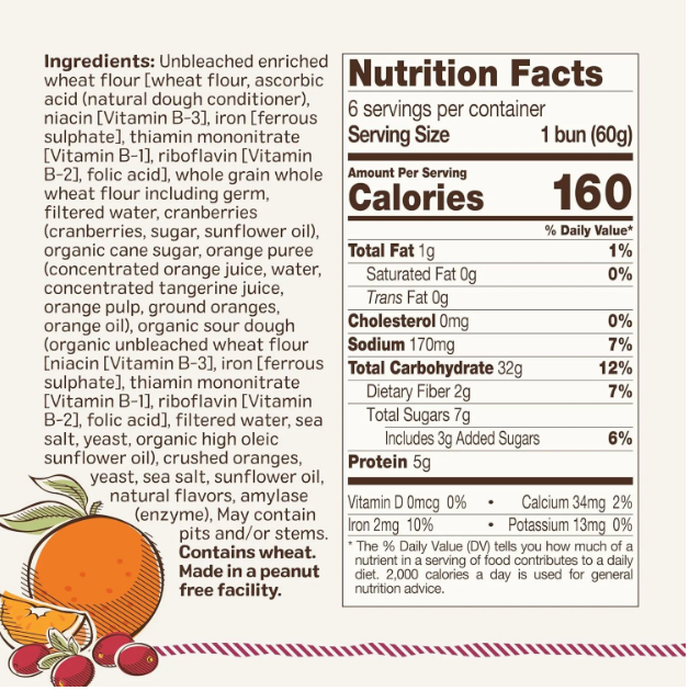Unbleached enriched wheat flour [wheat flour, ascorbic acid (natural dough conditioner), niacin [Vitamin B-3], iron [ferrous sulphate], thiamin mononitrate [Vitamin B-1], riboflavin [Vitamin B-2], folic acid], whole grain whole wheat flour including germ, filtered water, cranberries (cranberries, sugar, sunflower oil), organic cane sugar, organic sour dough (organic unbleached wheat flour [organic wheat flour, niacin [Vitamin B-3], iron [ferrous sulphate], thiamin mononitrate [Vitamin B-1], riboflavin [Vitamin B-2], folic acid], filtered water, sea salt, yeast, organic high oleic sunflower oil), orange puree, crushed oranges, natural flavors, yeast, sea salt, sunflower oil and/or canola oil, amylase (enzyme). May contain pits and/or stems. Contains Wheat. Made in a peanut free facility.