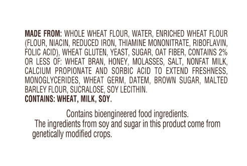 Made From: Whole Wheat Flour, Water, Enriched Wheat Flour (Flour, Niacin, Reduced Iron, Thiamine Mononitrate, Riboflavin, Folic Acid), Wheat Gluten, Yeast, Sugar, Oat Fiber, Contains 2% Or Less Of: Wheat Bran, Honey, Molasses, Salt, Nonfat Milk, Calcium Propionate And Sorbic Acid To Extend Freshness, Monoglycerides, Wheat Germ, Datem, Brown Sugar, Malted Barley Flour, Sucralose, Soy Lecithin. Contains: Wheat, Milk, Soy.