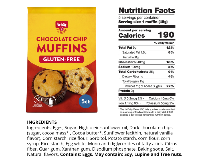 Eggs, Sugar, High Oleic Sunflower Oil, Dark Chocolate Chips (Sugar, Cocoa Mass, Cocoa Butter, Sunflower Lecithin, Natural Vanilla Flavor), Corn Starch, Rice Flour, Sorbitol, Potato Starch, Corn Flour, Corn Syrup, Rice Starch, Egg White, Mono- and Diglycerides of Fatty Acids, Citrus Fiber, Guar Gum, Xanthan Gum, Disodium Phosphate, Baking Soda, Salt, Natural Flavor. Contains: Egg May Contain: Soy, Lupine,